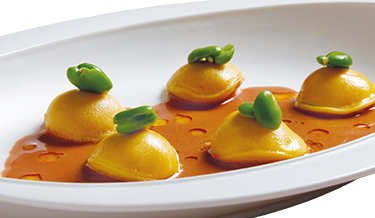 Raviolo di triglia, fave fresche e olio al limone