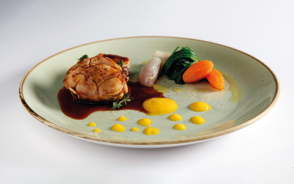Rotolo di coniglio, il suo fondo, giardiniera di verdure e salsa di peperoni grigliati