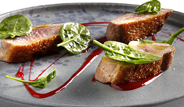 Petto d'anatra, pollo croccante e shrub ai lamponi