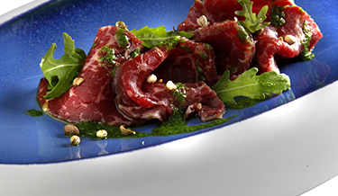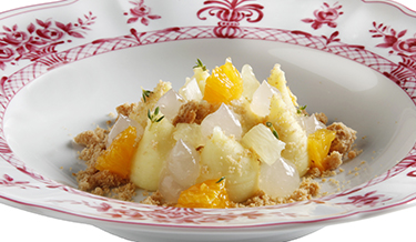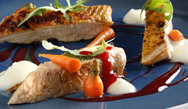 Petto di faraona scottato, gel di sedano rapa, dressing ai lamponi e c...