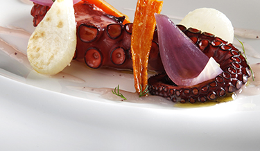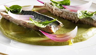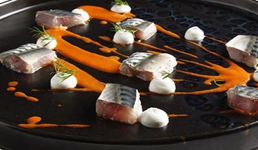 Sgombro marinato a freddo, peperone arrosto liquido, insalatina di man...