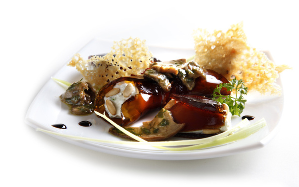 Place a tablespoon of porcini mushrooms sautéed with garlic and parsley, place one of the cannoli on top, cut in half, and finish with a sprinkling of parmesan crunch. Decorate the side of the plate with a drizzle of Olitalia “5 Grappoli” I.G.P. balsamic vinegar of Modena and a sprig of fresh dill.
