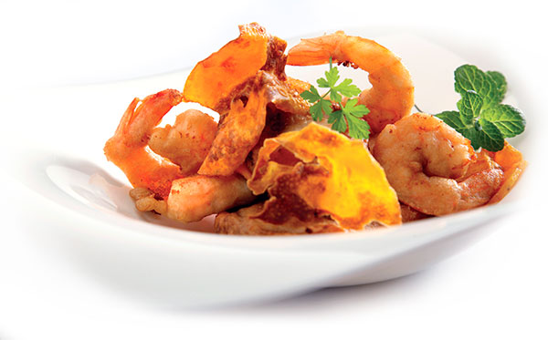 Tempura of caramote prawns and turbot fillets with orange hints and fried butternut squash chips